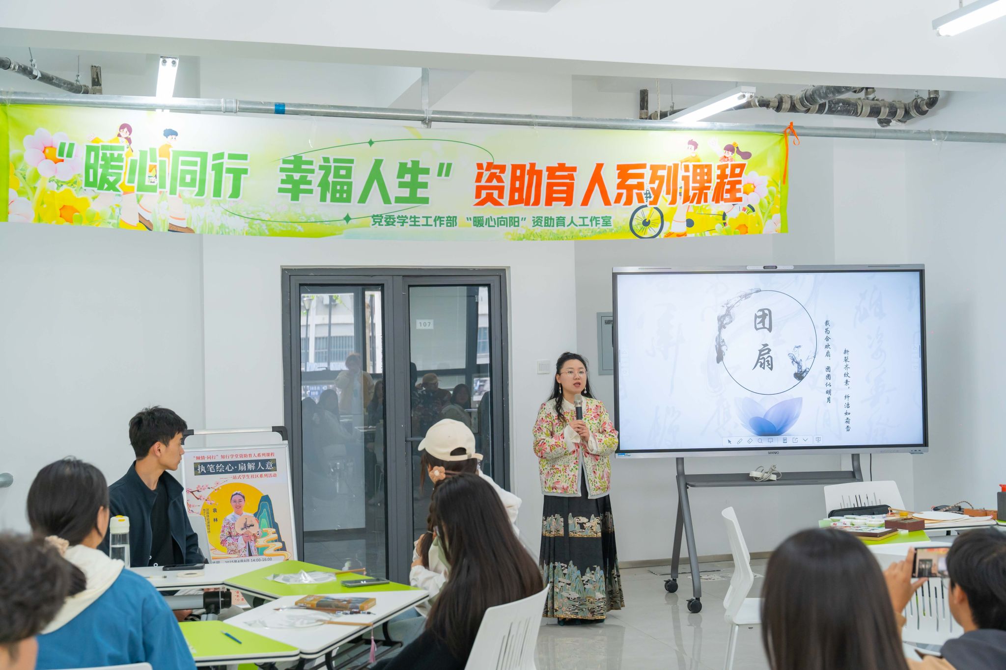 本网讯【通讯员 刘秀丽 袁林】为弘扬中华优秀传统文化,深化学校资助育人实效,4月8日,我校“倾情·同行”知行学堂资助育人系列课程之“执笔绘心·扇解人意”团扇文化体验活动在一站式U+空间温情启幕。本次活动由学校“暖心向阳”资助育人工作室、“新芯向荣”辅导员工作室和“小袁微宇”网络思政工作室联合举办,聘任电子工程学院学工办主任、团委书记袁林担任“团扇体验课”微导师,吸引来自不同学院不同专业的30余名学子参与其中。师生们在轻松愉悦的氛围中共赴一场传统美学与现代思政交融的文化盛宴。