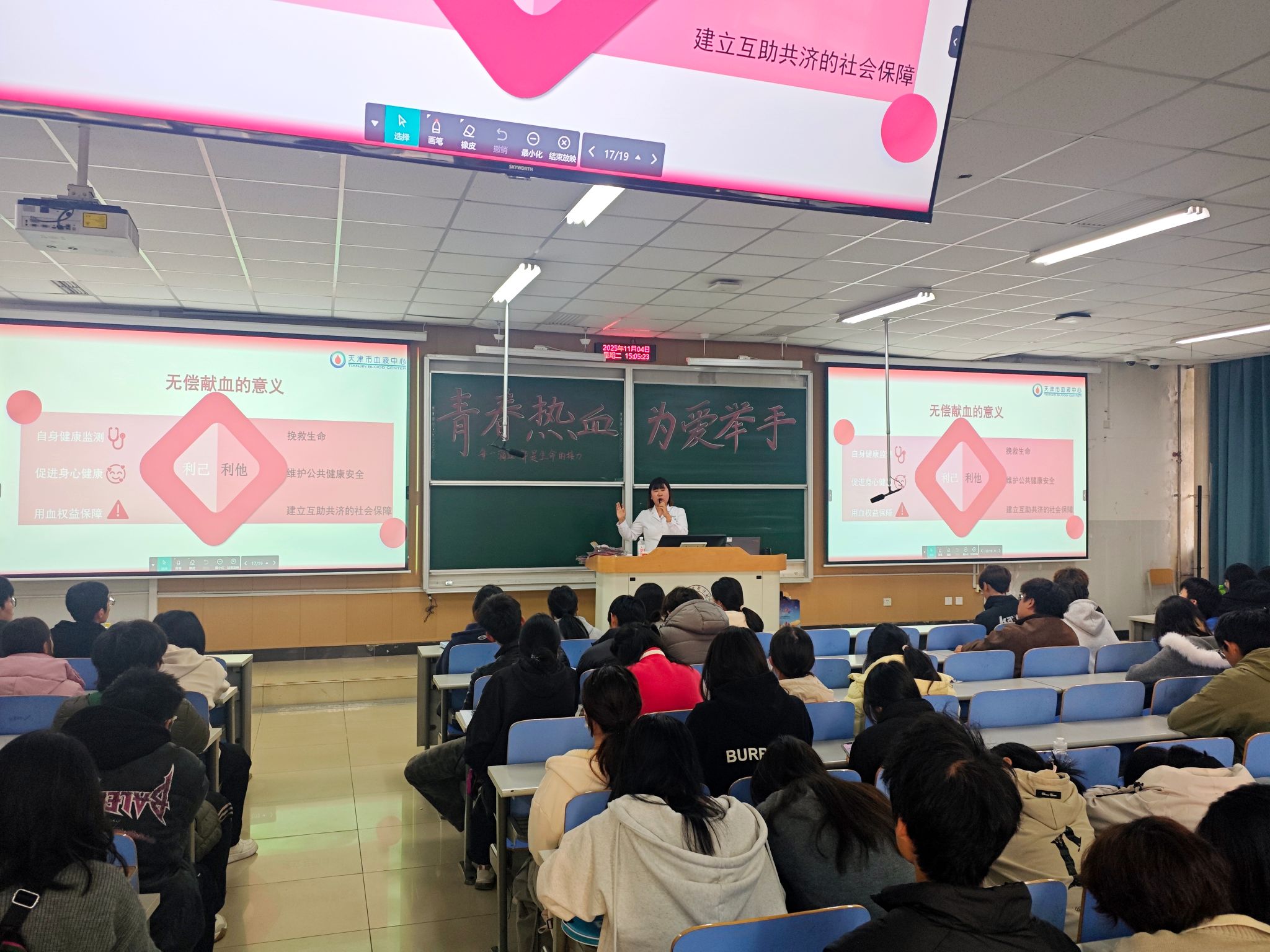本网讯【通讯员 王希】为打破传统认知壁垒,点燃青年学子的公益热忱,11月4日,我校在第二教学楼举办“青春热血·为爱举手”无偿献血主题讲座。本次活动邀请天津市血液中心资深医师彭云杰、李杨担任主讲,以沉浸式体验、互动式答疑、故事化分享的创新形式,让无偿献血知识真正走进青年心间,200余名师生到场参与活动。