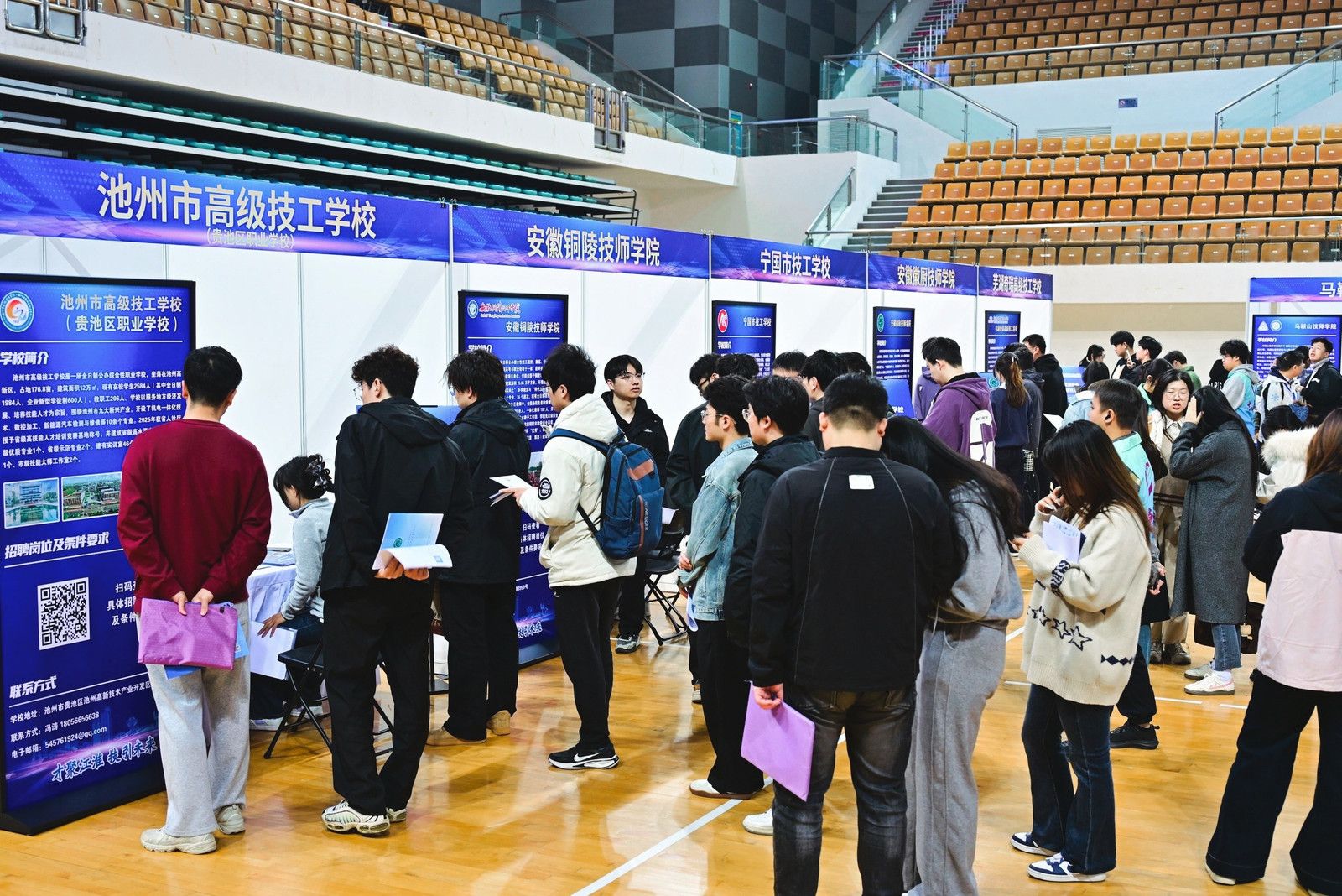 本网讯【通讯员 王洪闰】为深入学习贯彻党的二十届四中全会精神,落实国家新时代高技能人才队伍建设部署,进一步加强安徽省人力资源和社会保障厅与我校的合作,11月11日,由安徽省人力资源和社会保障厅组织的“安徽省招才引智高校行——‘才聚江淮 技引未来’安徽技工院校教师专场招聘活动”在我校体育馆成功举办。校党委常委、副校长李富森莅临现场指导工作。