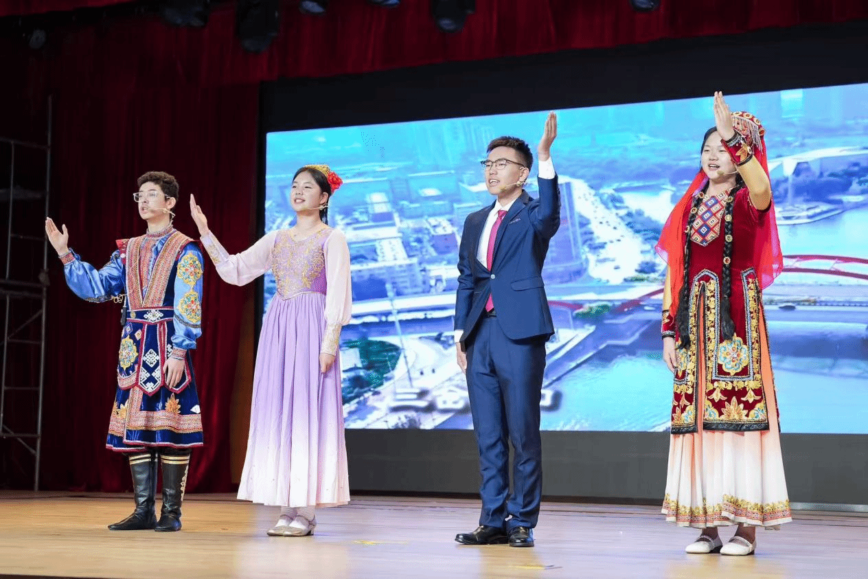 两项赛紧扣“铸牢中华民族共同体意识”核心,以学校民族团结进步教育为底色,将天津地域文化与师生成长故事巧妙融合。“漫步五大道时,老建筑墙上的砖纹都在诉说天津的多元包容”,选手们围绕“天津第二故乡”,分享着在津求学的暖心点滴。提及“中华人民共和国成立76周年”“中国人民抗日战争暨世界反法西斯战争胜利 80周年”,选手们或讲述英烈事迹,或展示家乡巨变,眼神中满是崇敬与自豪。谈到“西藏自治区成立60周年”“新疆维吾尔自治区成立 70周年”,一幅幅边疆繁荣发展的图景通过演讲铺展开来,彰显内地与边疆同心共进的深厚情谊。而“中华民族伟大复兴”的目标,则让不同学段的学生许下不负韶华的誓言,让教师们坚定立德树人的初心。比赛形式更是亮点纷呈,让现场仿佛变成一堂沉浸式的“民族团结教育实践课”。