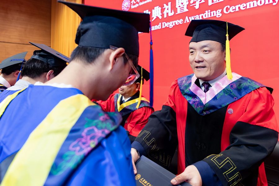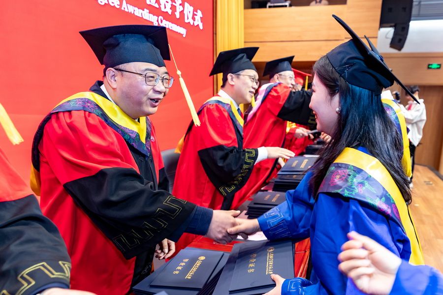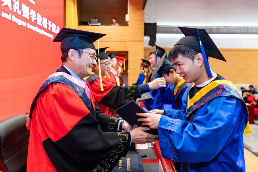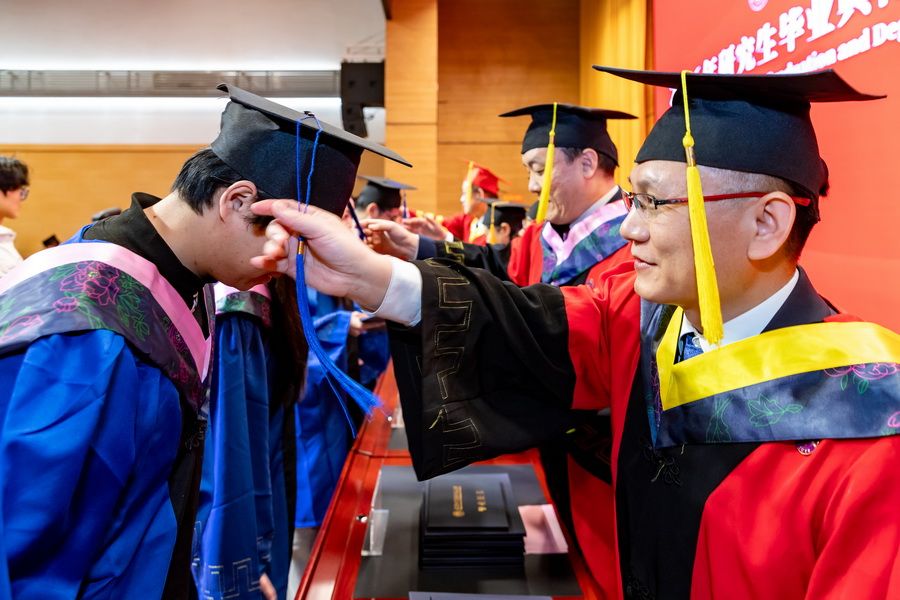 在学位授予仪式上,主席台领导为毕业研究生逐一拨穗正冠、颁授学位证书与毕业证书,并与同学们亲切合影留念,定格下这一珍贵美好瞬间。