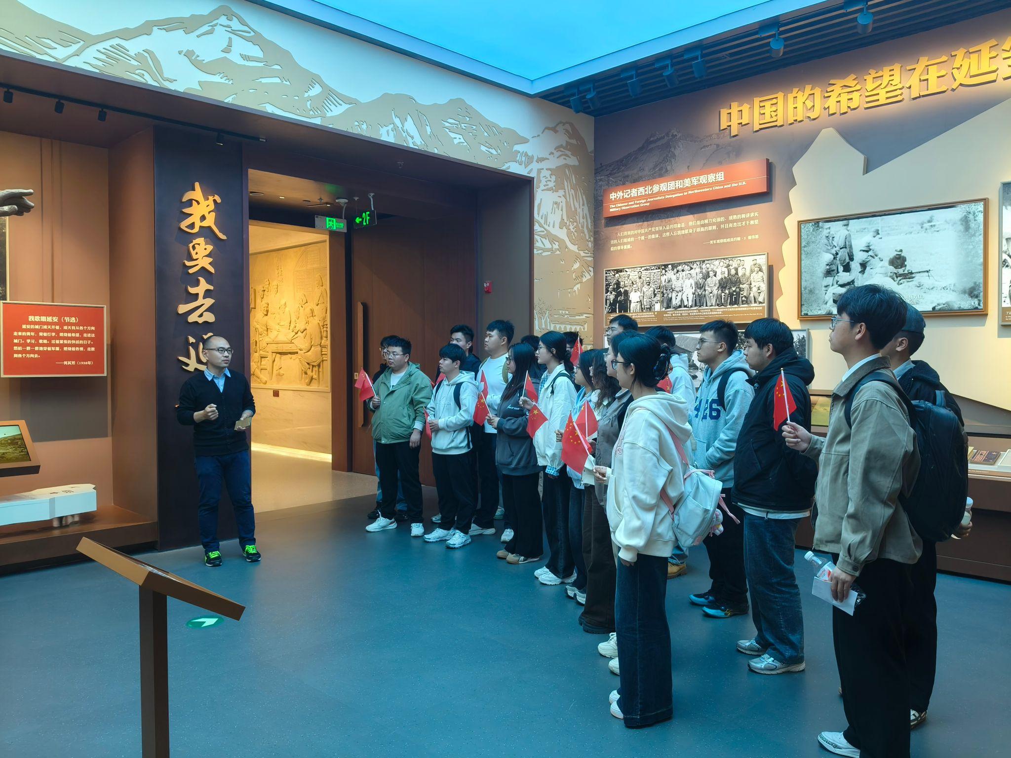 在中国人民抗日战争纪念馆中,师生依次参观“铭记历史、缅怀先烈、珍爱和平、开创未来”主题展览,马克思主义学院王海广老师结合馆内丰富的史料与实物展陈,带来一堂《我要去延安》的沉浸式微党课,追忆无数爱国青年奔赴延安、寻求真理、坚定革命信仰、勇于冲锋陷阵的峥嵘岁月。学生们在珍贵的历史图片、饱经战火的文物、复原的战斗场景中深切感受中华儿女冒着敌人炮火共赴国难、英勇抵抗日本军国主义侵略的光辉历程。